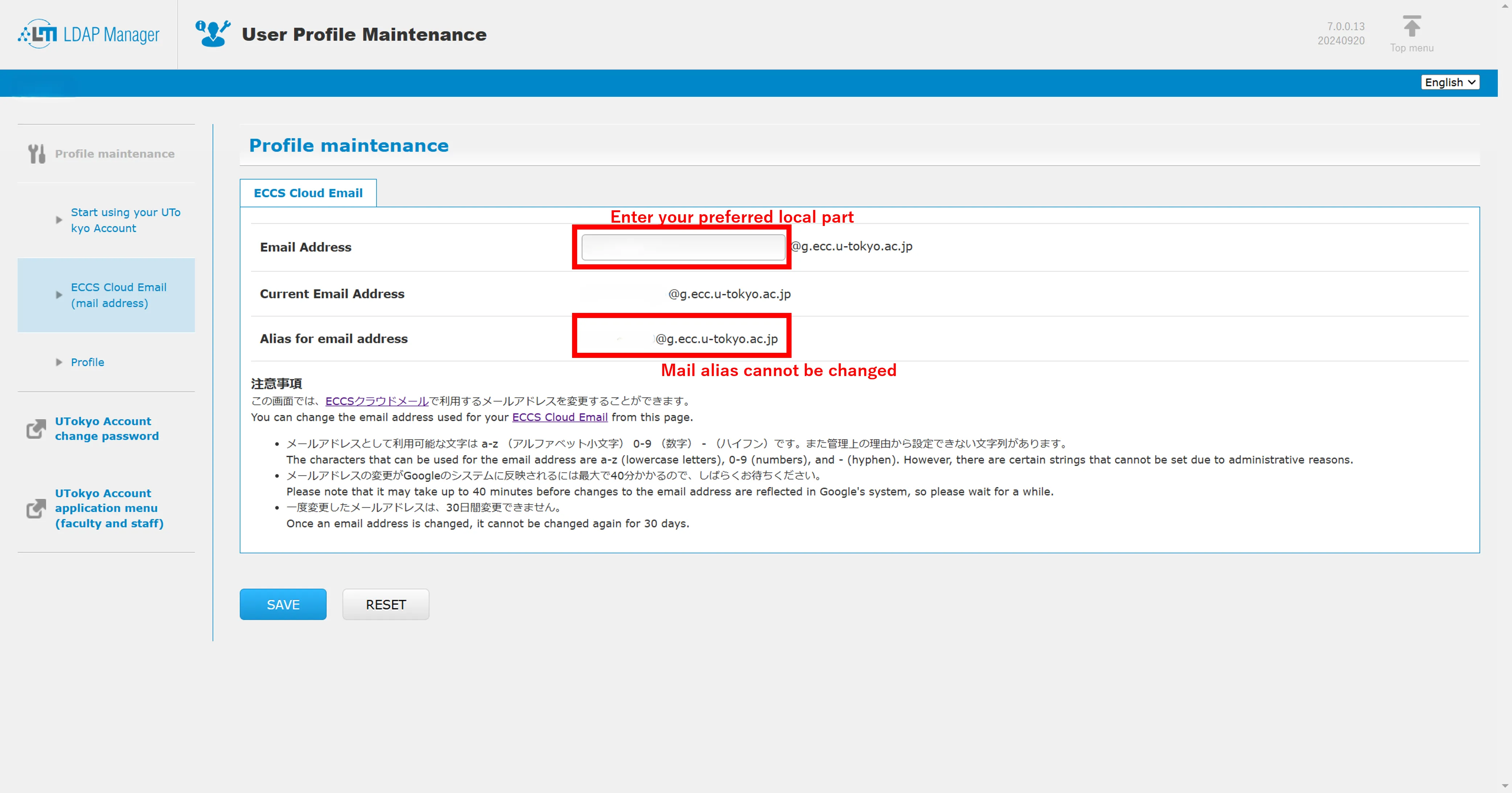 Additionally, you can set the part before the @ in the University of Tokyo email address xxxx@g.ecc.u-tokyo.ac.jp on your own. If you have not set, “10-digit common ID+@g.ecc.u-tokyo.ac.jp” will be your email address.