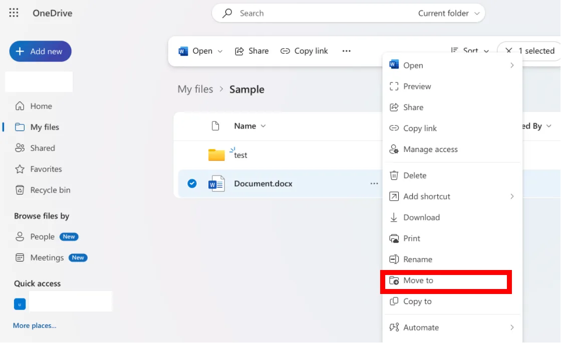 • You can also move multiple files in batches. Hover over the file you wish to move, then turn on the checkbox displayed on the left of the icon for each file. After that, please click “Move to” at the top of the screen. (If the “Move to” button is not visible, please click the three-dot icon at the top of the screen).
