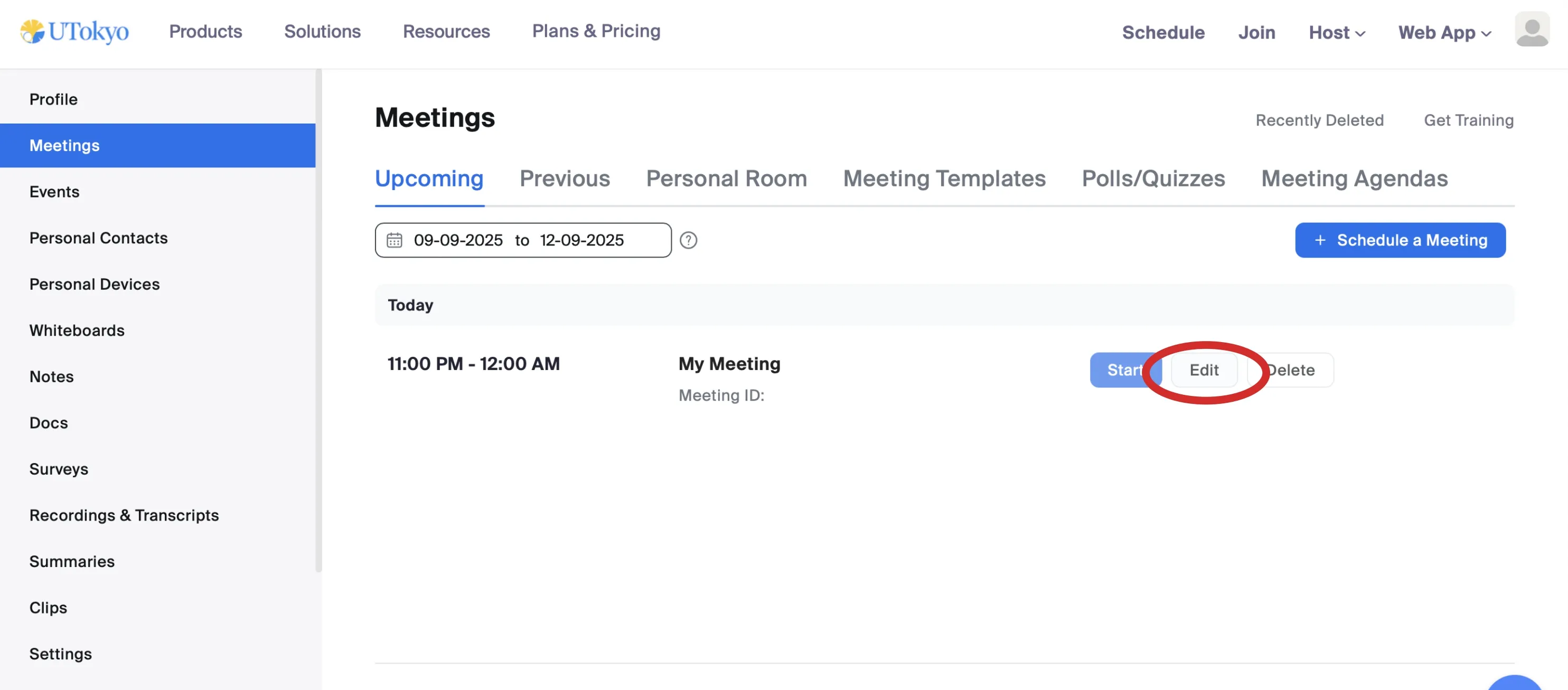 These operations can be performed not only from the browser but also from the app. Select the Meetings tab, click the …icon for the relevant meeting, and then select Edit.