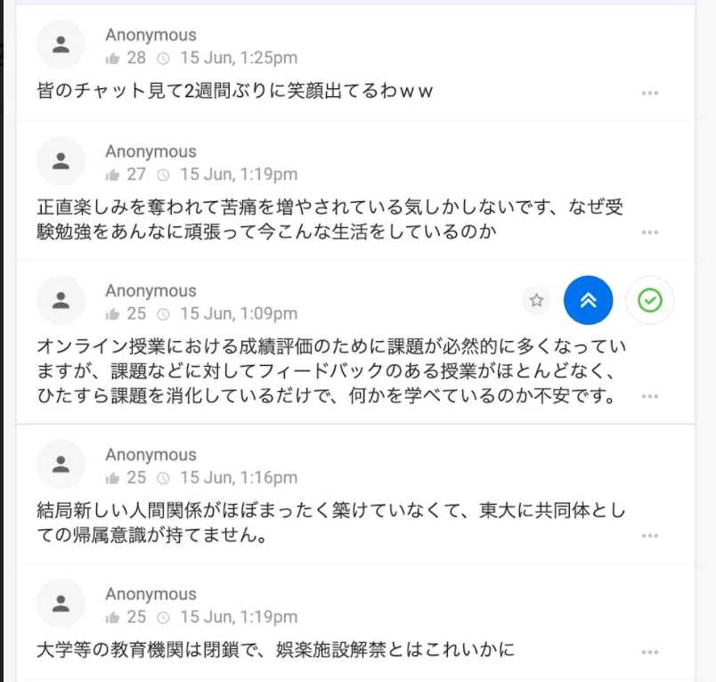 授業中、前述の Slido に学生から「もう辛いです」といった書き込みが相次いだことをきっかけに、愚痴を言い合う会を開催しました。
