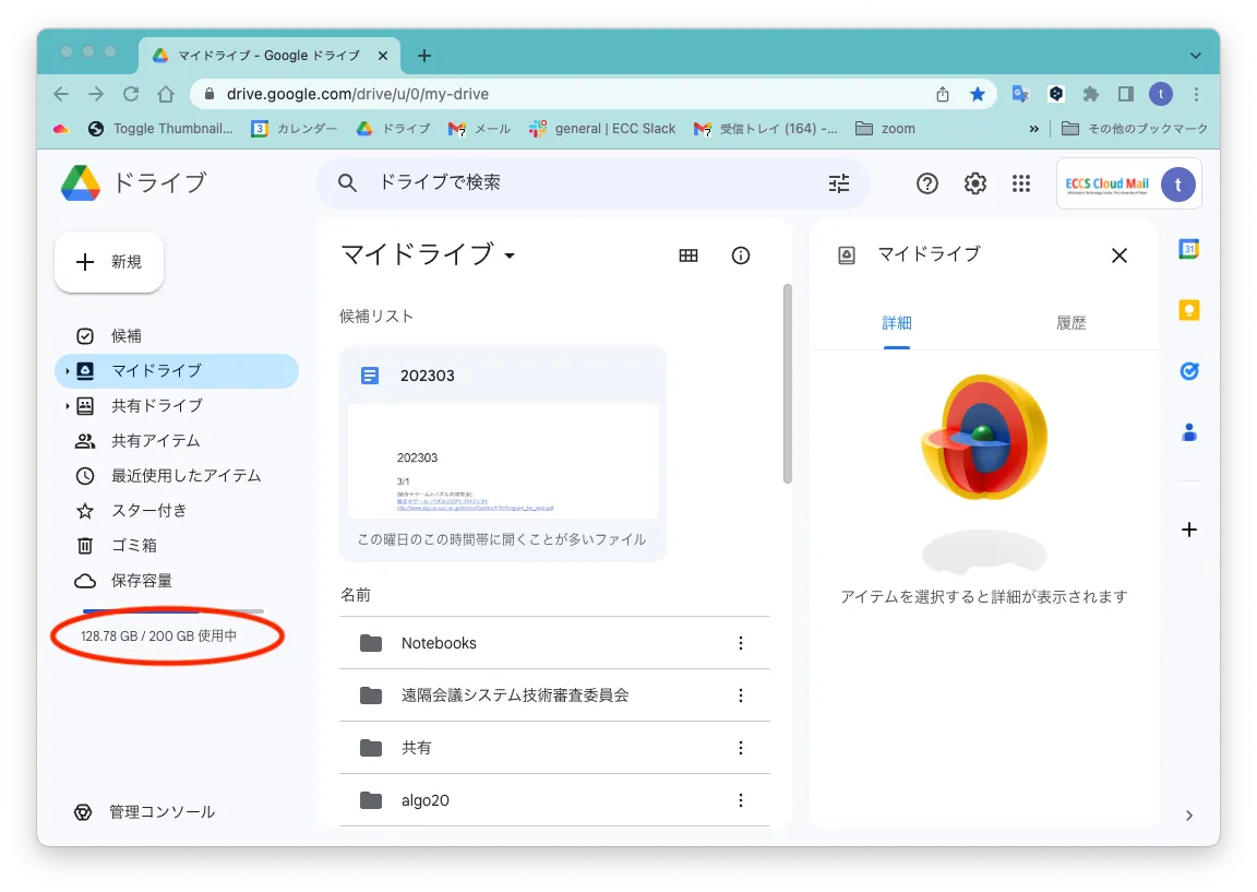 - マイドライブの容量と使用量はGoogleドライブのトップページから確認できます.