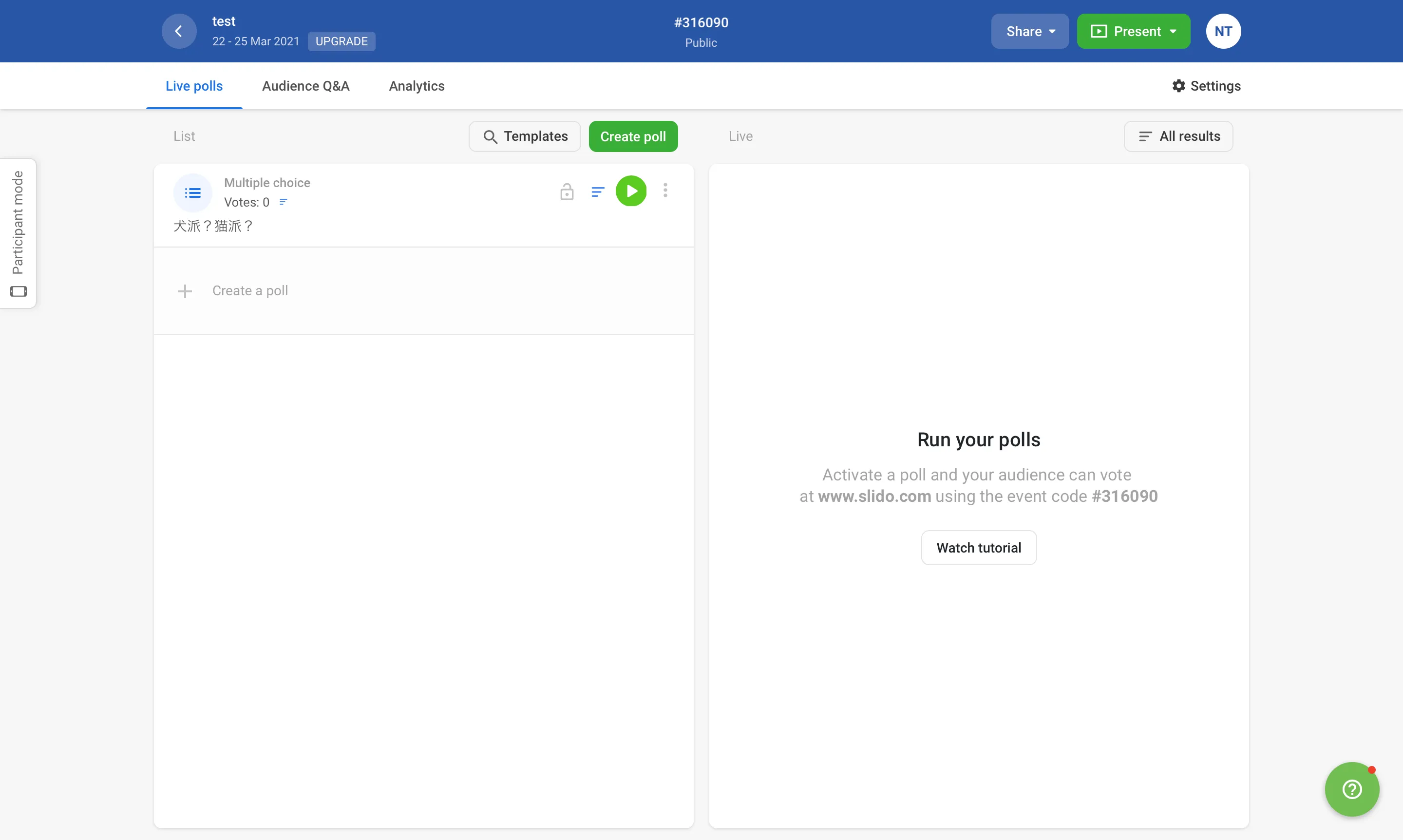 Slidoでは,投票(polls)機能を使うことで,教員から学生に対して質問やクイズを行うことができます. 画面左上の「Live polls」を選択してください.