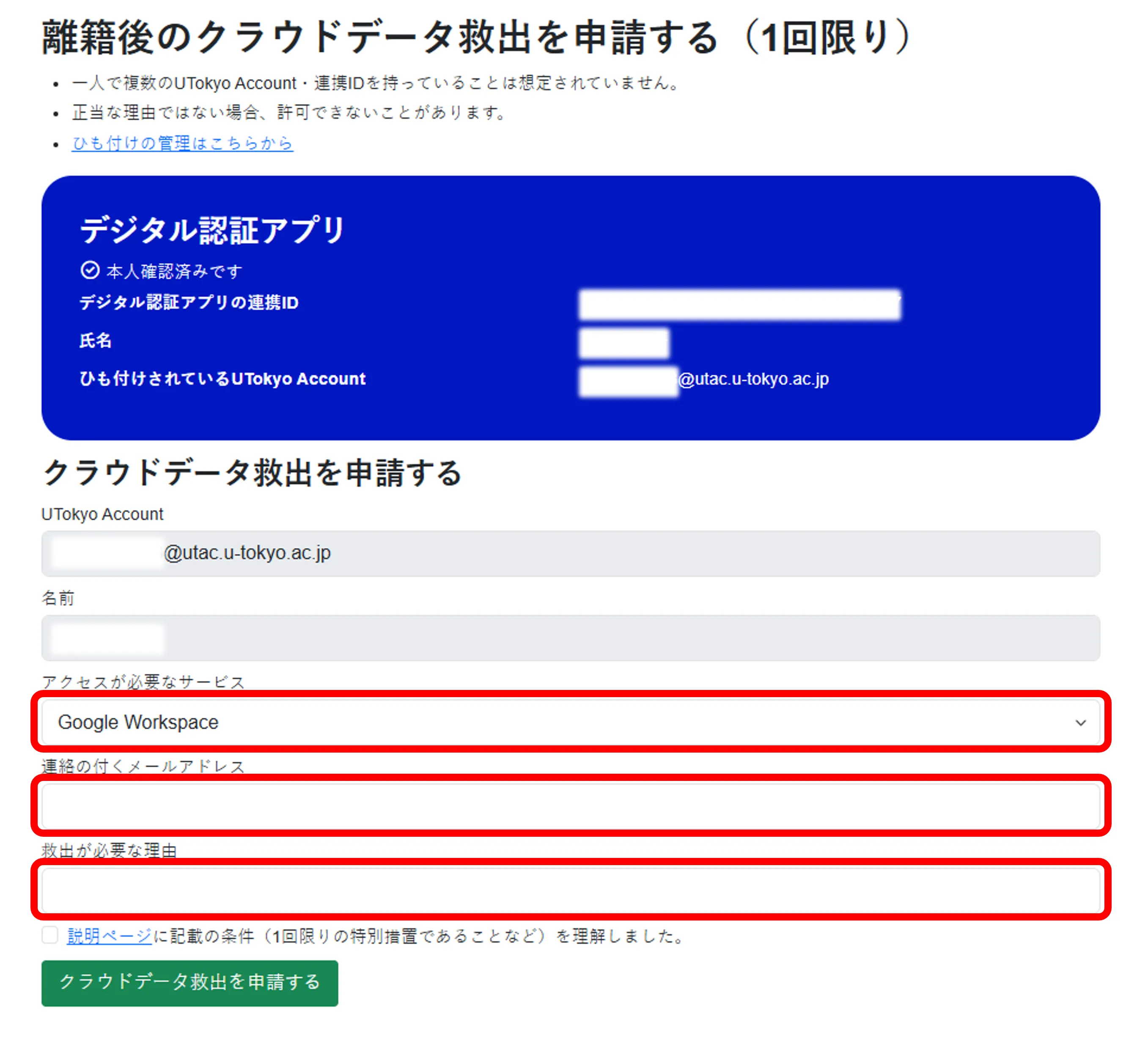クラウドデータ救出を希望する方は「UTokyo Account本人確認サービス」を通じて申請してください.
