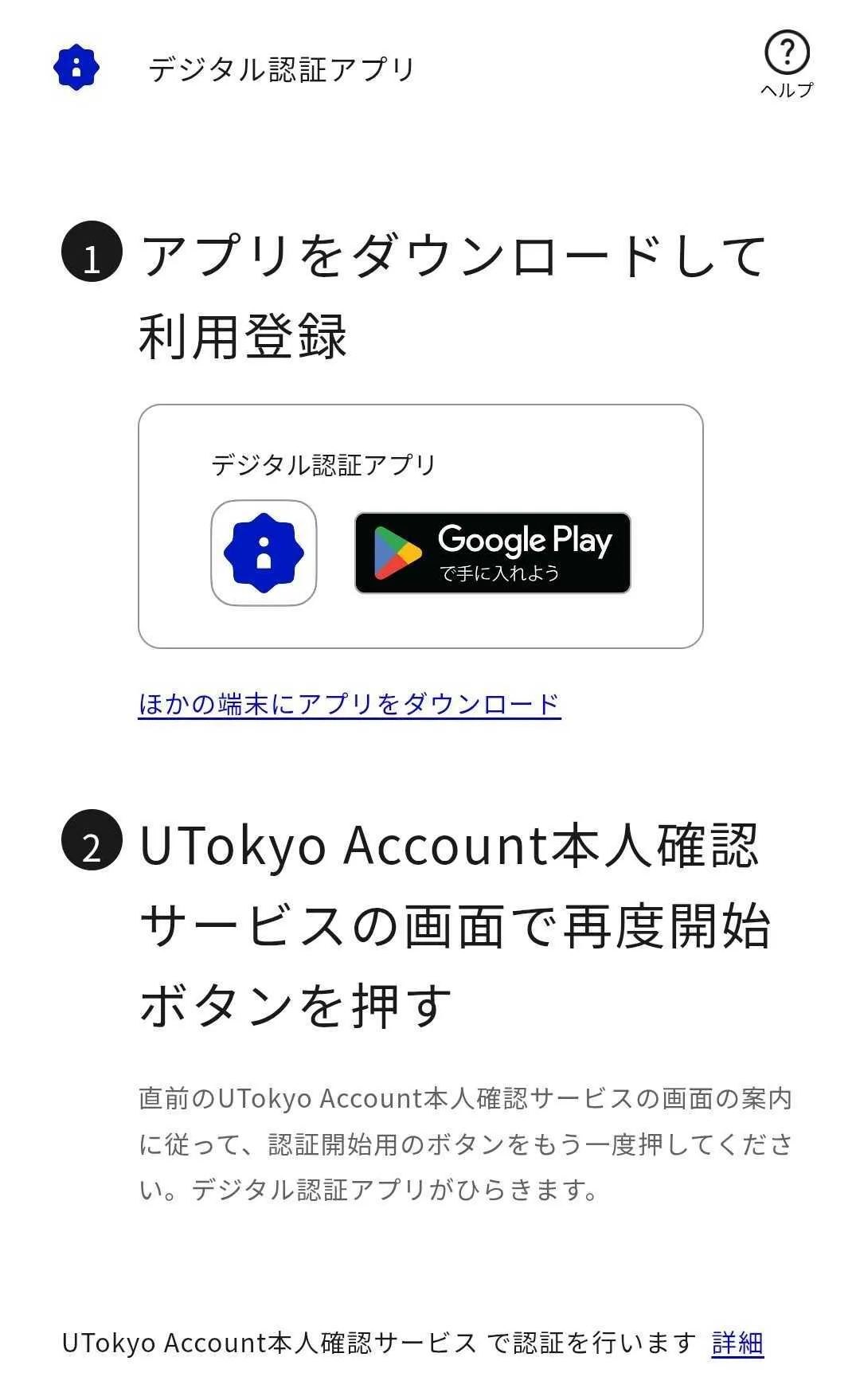 デジタル認証アプリがインストールされていない場合は,以下のようにアプリのインストールを促す画面が表示されます.またブラウザの表示倍率の設定によっては,PCからのアクセスと判定され,画面にQRコードが表示されることもあります.いずれの場合も,手順1に従って,デジタル認証アプリのインストールと利用登録を行ってください.