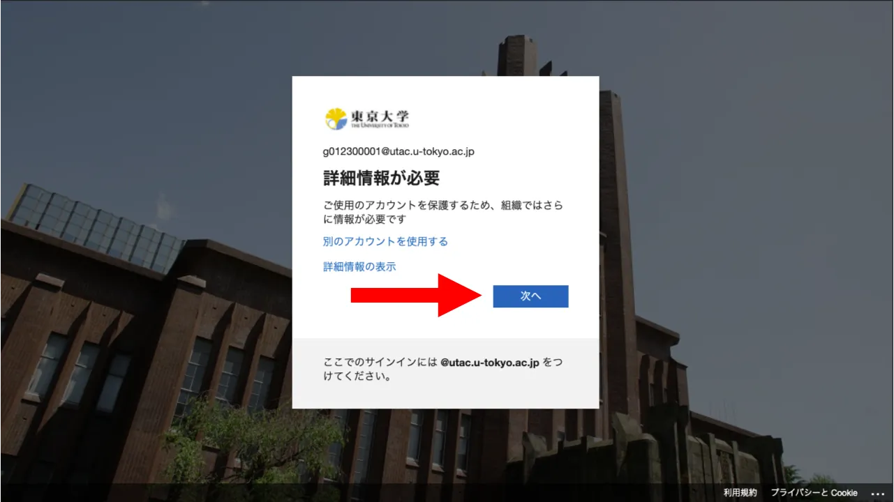 - 「詳細情報が必要」という画面が表示されるので,「次へ」を押してください.