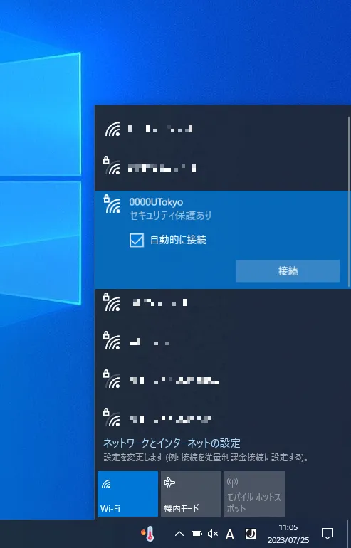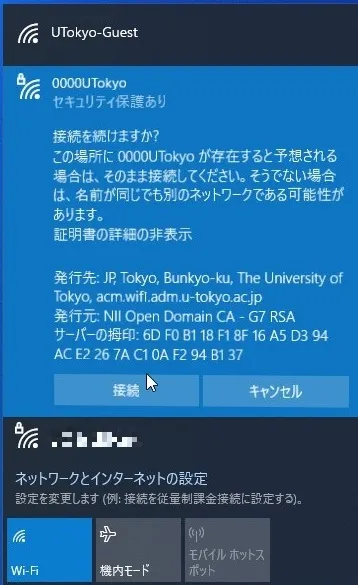 0000UTokyoというSSIDが見つからない場合は 場所によっては,UTokyo Wi-Fiの電波が届いていない可能性があります.場所を変えて再度試してみてください.これまで問題なく利用できていたにもかかわらずSSIDが見つからない場合は,uteleconサポート窓口から問い合わせてください.